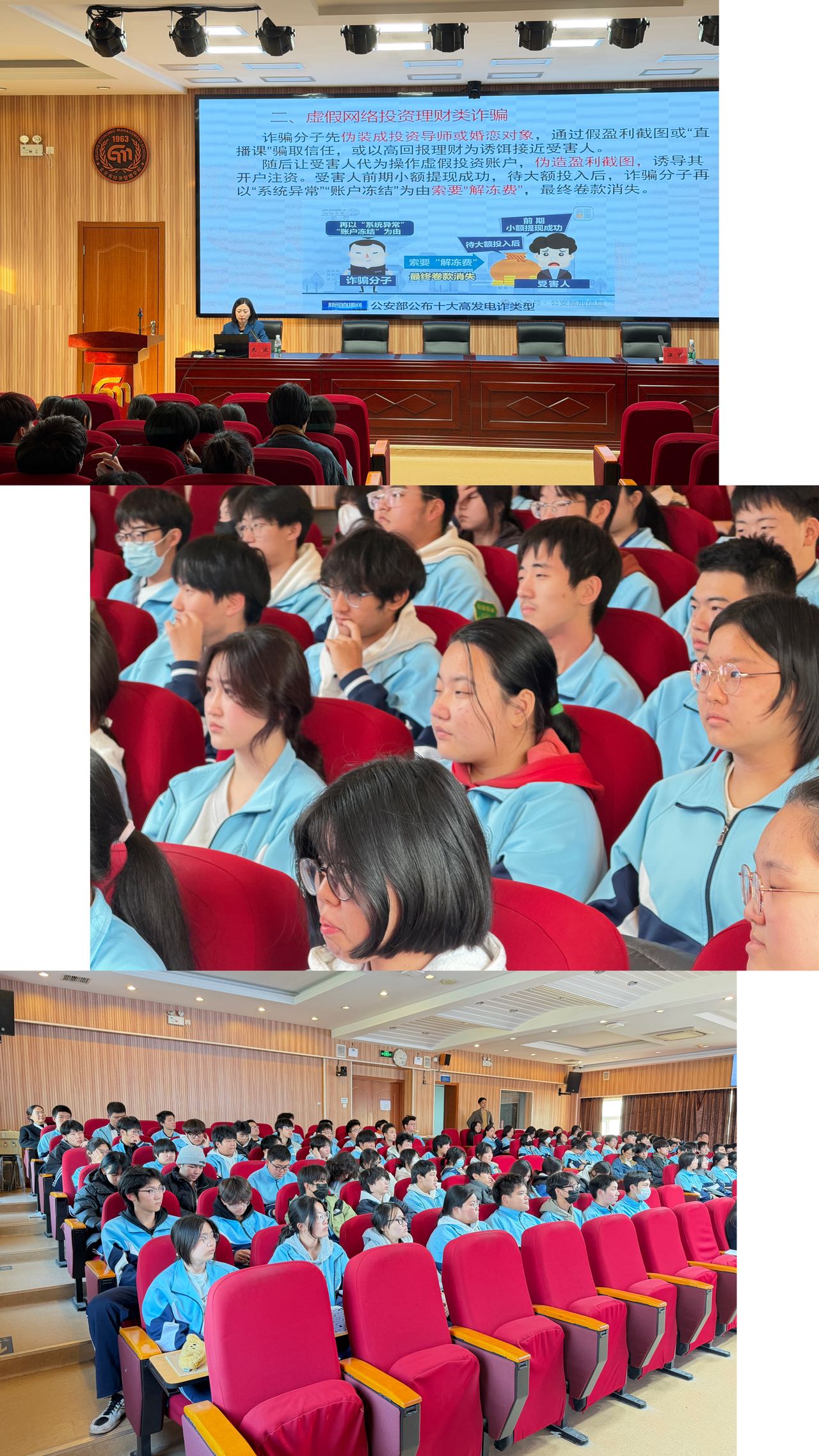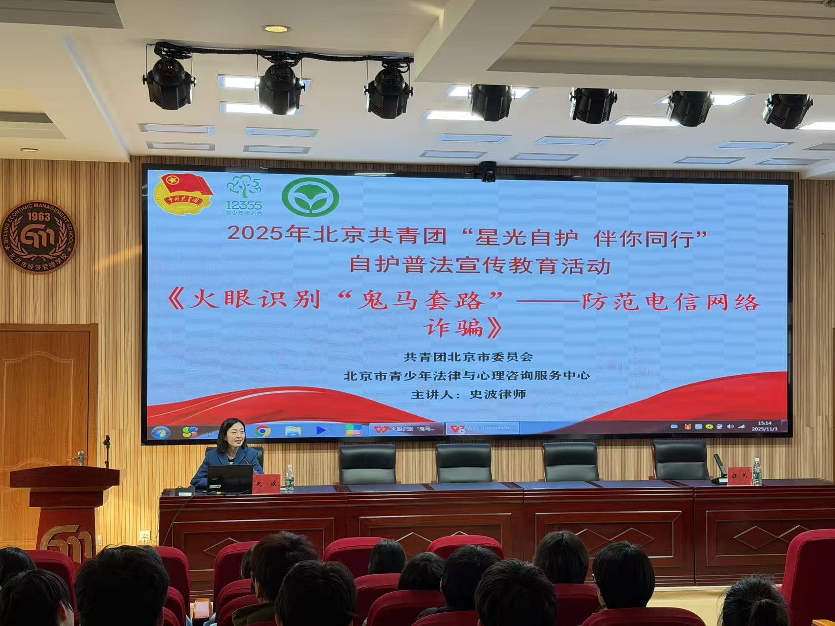 为切实提升学生防范电信网络诈骗的意识和能力,守护师生财产安全,营造平安和谐的校园环境,11月3日,北京市经济管理学校特邀资深法律专家、北京榜样・最美义工史波律师,开展“火眼识别‘鬼马套路’——防范电信网络诈骗” 主题讲座。本次讲座采用线下宣讲形式,全校学生参与聆听,德育处汪艺主任主持此次讲座。