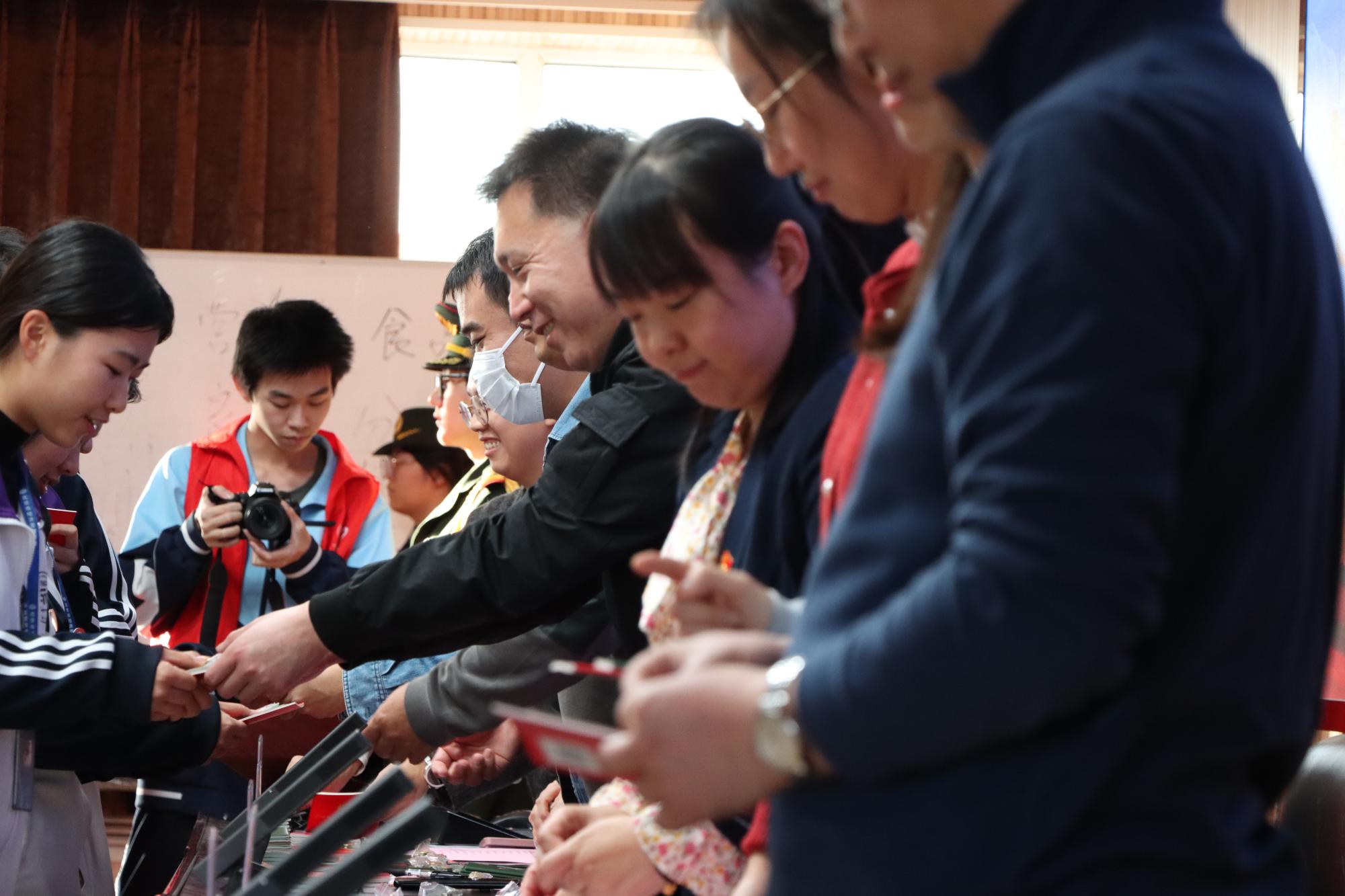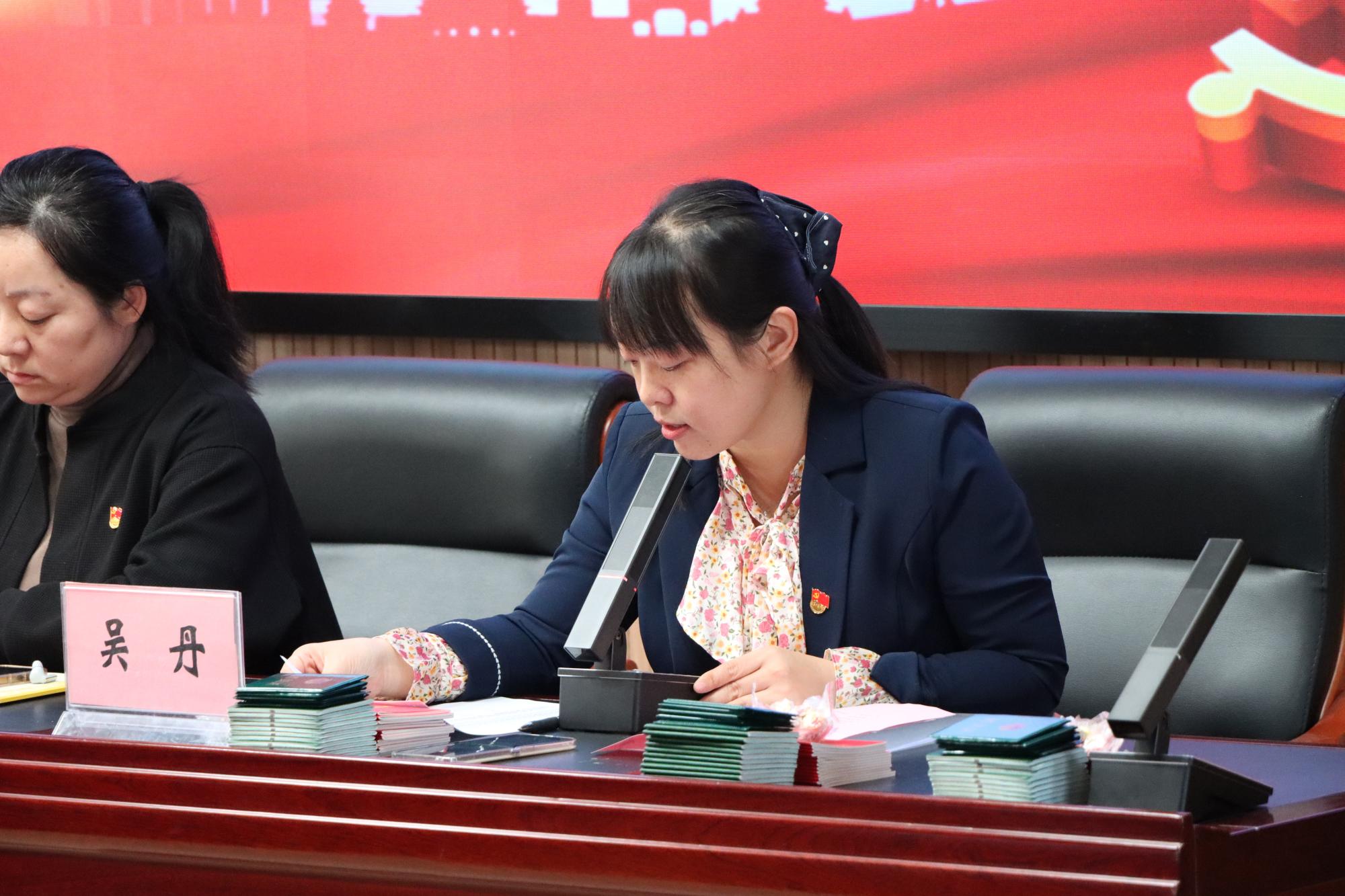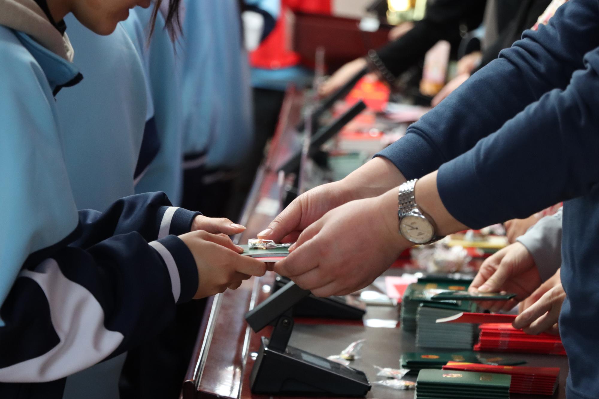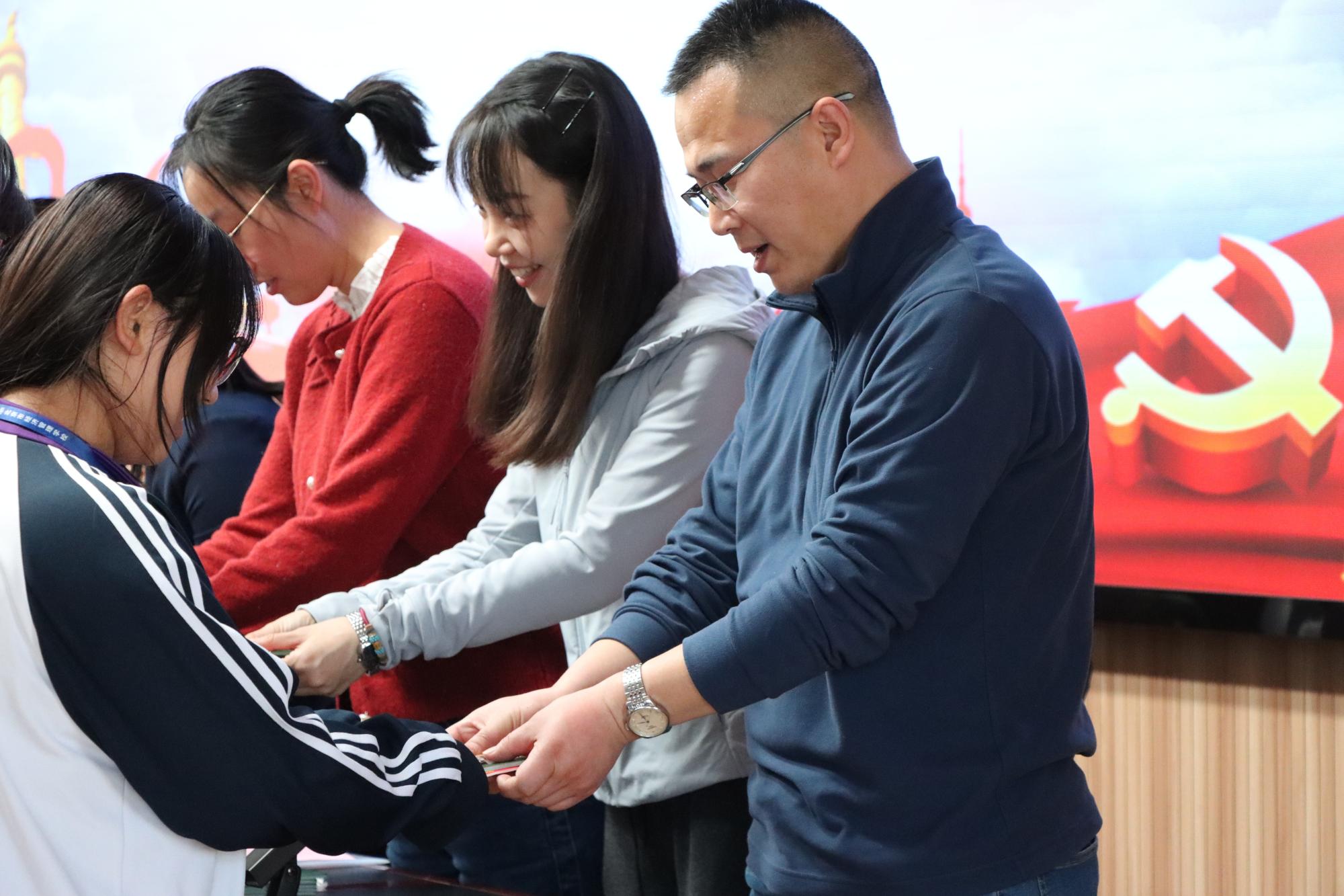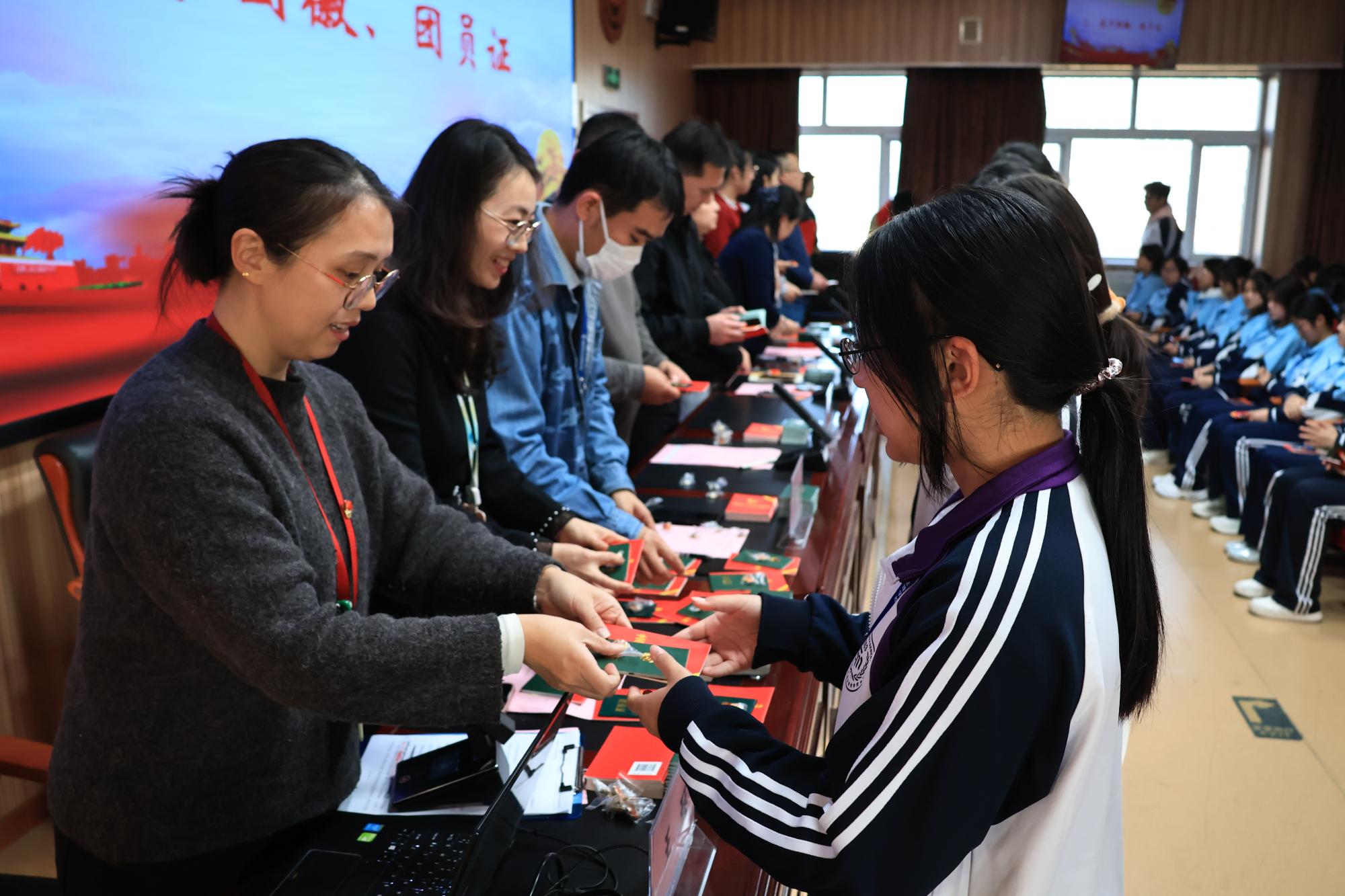 伴随着庄严的国歌声,宣誓仪式正式开始。团委书记吴丹老师宣读了新团员名单后,各位领导与班主任老师们共同为新团员授予团徽、团员证。