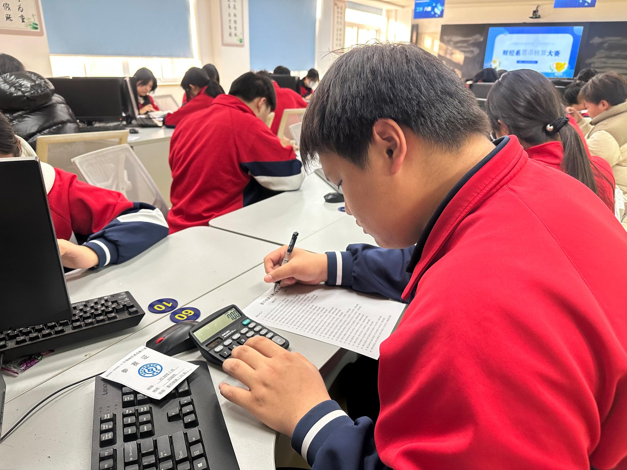 比赛期间,各赛场秩序井然。在手工记账赛场,选手们凝神静气,依据原始凭证熟练填制记账凭证,笔墨间尽显严谨细致;在票币核算和财经综合技能赛场,快速的点钞声与精准的键盘敲击声交织,考验着选手的速度与准确度;会计基础知识赛场,学生笔尖流淌的是对专业理论的深刻理解。全体参赛选手全情投入,将日常所学转化为赛场上的从容应对,充分体现了扎实的训练成果。