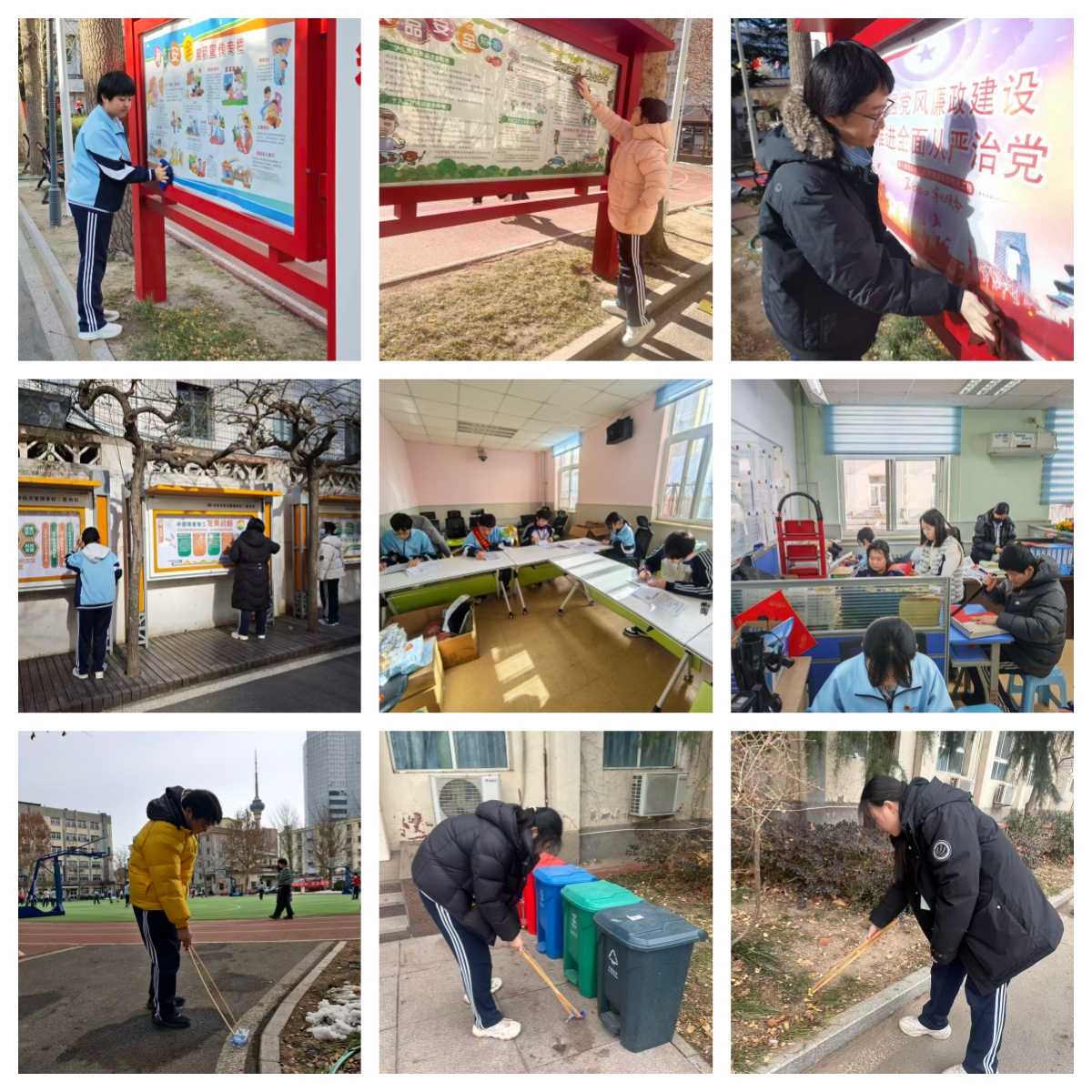 活动期间,所有学子均严格遵守各项工作要求,始终以高标准践行榜样使命。在“德育助力・榜样同行”岗位上,学子们每日中午在校园值守,以友善谦和的态度为同学们提供引领服务,耐心解答咨询,协助老师工作,用细致服务传递榜样正能量;“拾净校园・微光护美”行动中,学子们穿梭于北楼周边、西楼周边及操场等公共区域,弯腰捡拾生活垃圾与杂物,不放过任何卫生死角,用双手守护校园的整洁清爽;“擦亮窗明・焕新校园”专项活动里,每周二学子们集中发力,负责橱窗的清洁工作,细致擦拭玻璃与框架上的灰尘污渍,让校园橱窗重新焕发光彩,确保展示内容清晰美观。