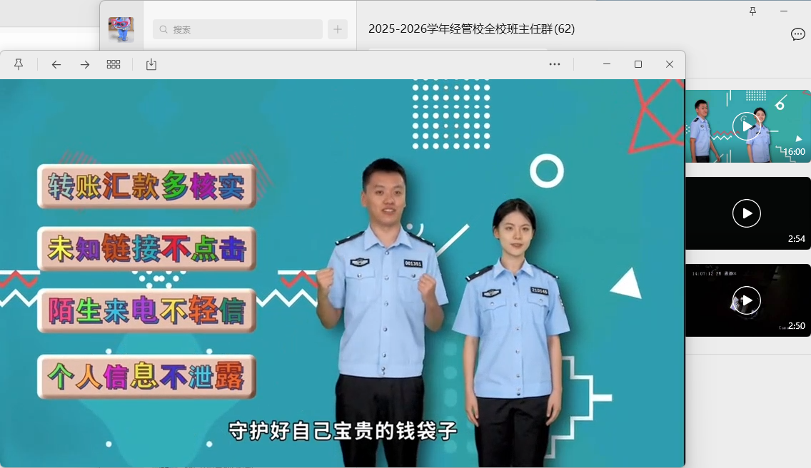 学校多措并举拓宽宣传渠道,推动反诈教育走深走实。学校开展了反诈宣传视频活动,学生积极参与录制视频报送学校;学校推选优秀作品依托校园电子屏循环播放反诈视频、提示语;通过各类工作群定向推送,打通宣防“最后一公里”;各班主任利用大课间,组织学生集中观看反诈专题视频,结合青少年易遭遇的诈骗案例,用通俗语言拆解套路、讲解防范方法,学生认真观看、主动记录,会后纷纷交流心得,进一步加深了对反诈知识的理解,切实提升了自我保护能力。