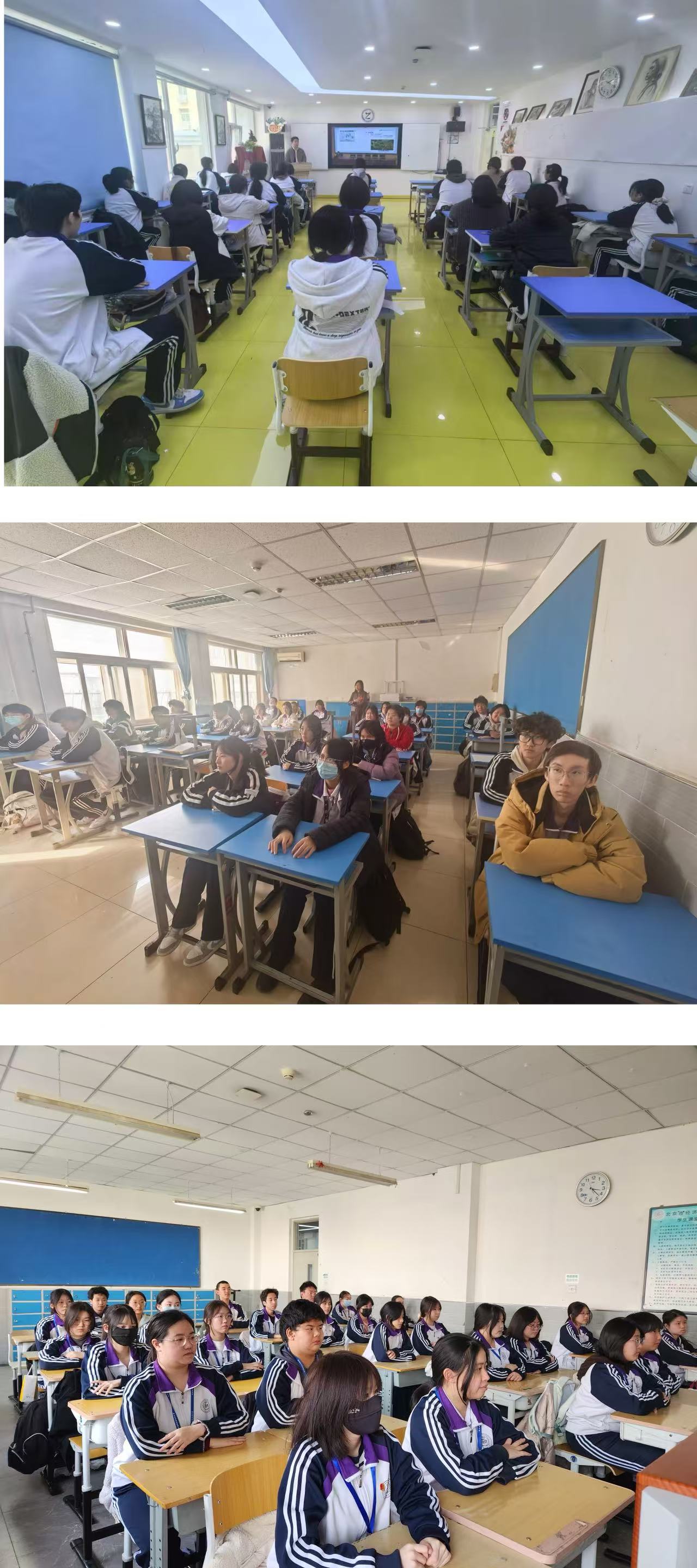 讲座现场,同学们全神贯注、认真聆听,时而低头记录重点知识,时而跟随讲解思考结核病防控要点。线上直播课堂中,各班同学坐姿端正、专注投入,积极跟随老师的思路学习,展现出良好的学习状态与健康防护意识。